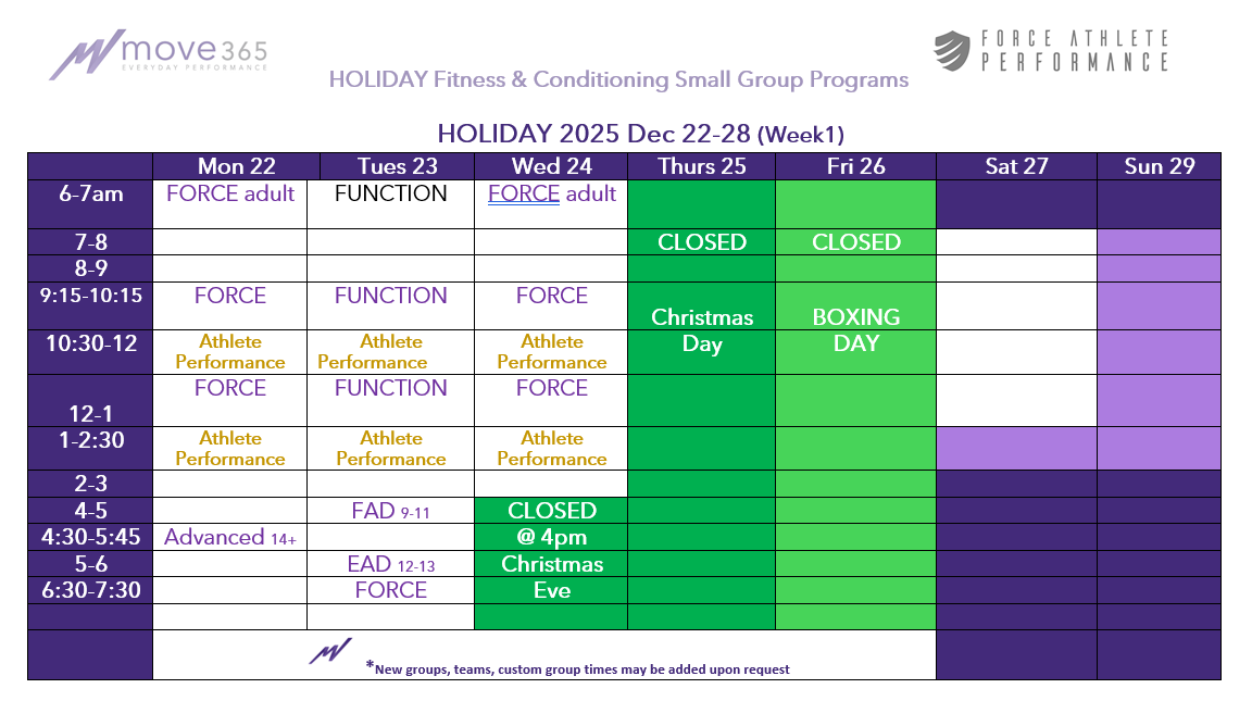 The game of hockey, while intense and physical, does not create adequate opportunity for strength and conditioning development. The opposite usually results. A well designed training schedule can stop the potential decline and should continue to allow the athlete to improve. It should develop athletic foundations, increase performance, improve mobility/stability, and help maximize recovery & regeneration. As the season starts the timing is perfect to re-set the body, re-focus on new goals and re-boot the training program within the in-season schedule. This means working around practices and competitions, scheduling on and off-ice development and considering recovery and adaptation needs such as nutrition, hydration, rest and sleep. From a programming perspective, the program should build intensity and complexity back up through the fall, then re-set again in December in order to peak for the post-season and playoffs in Feb/March.